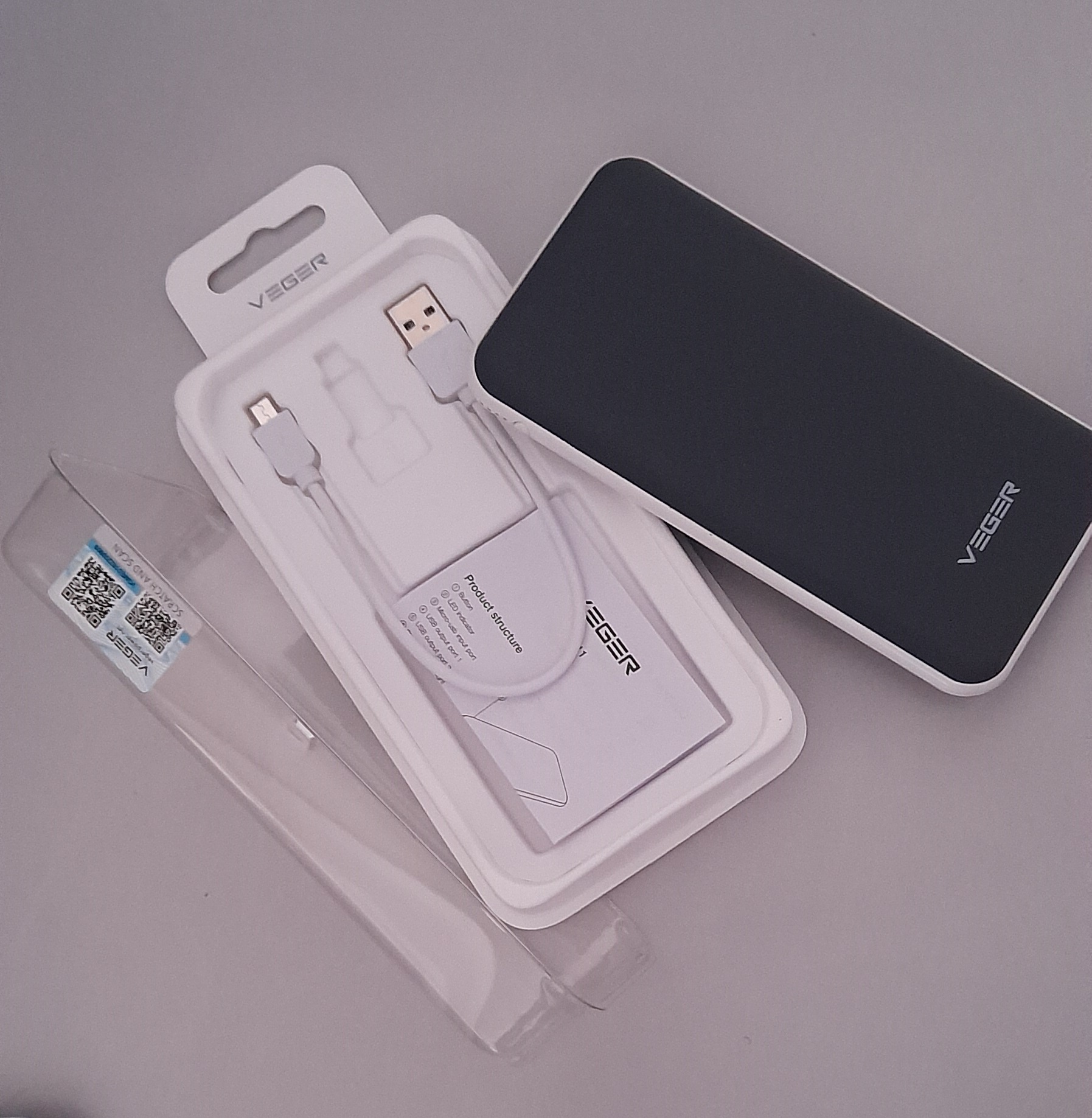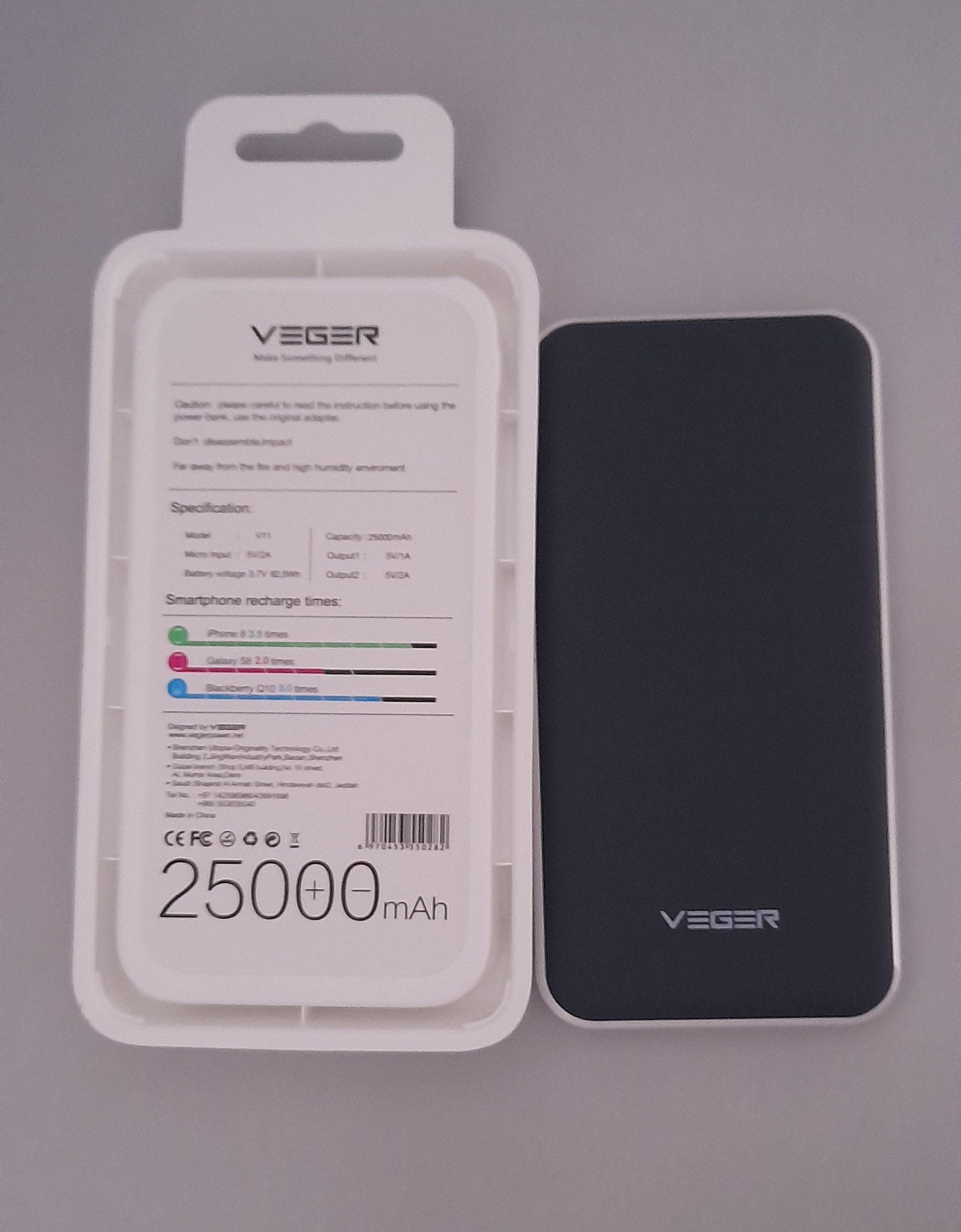 Veger v11 25000mah power bank for smartphones brand: veger model number: v11 capacity: 25000mah number of charging ports: 2 input: 5v/2a output 1: 5v/1a | output 2: 5v/2a compatible devices: multi dimension : 147*75*14mm weight: 222g -compact design and high battery capacity.